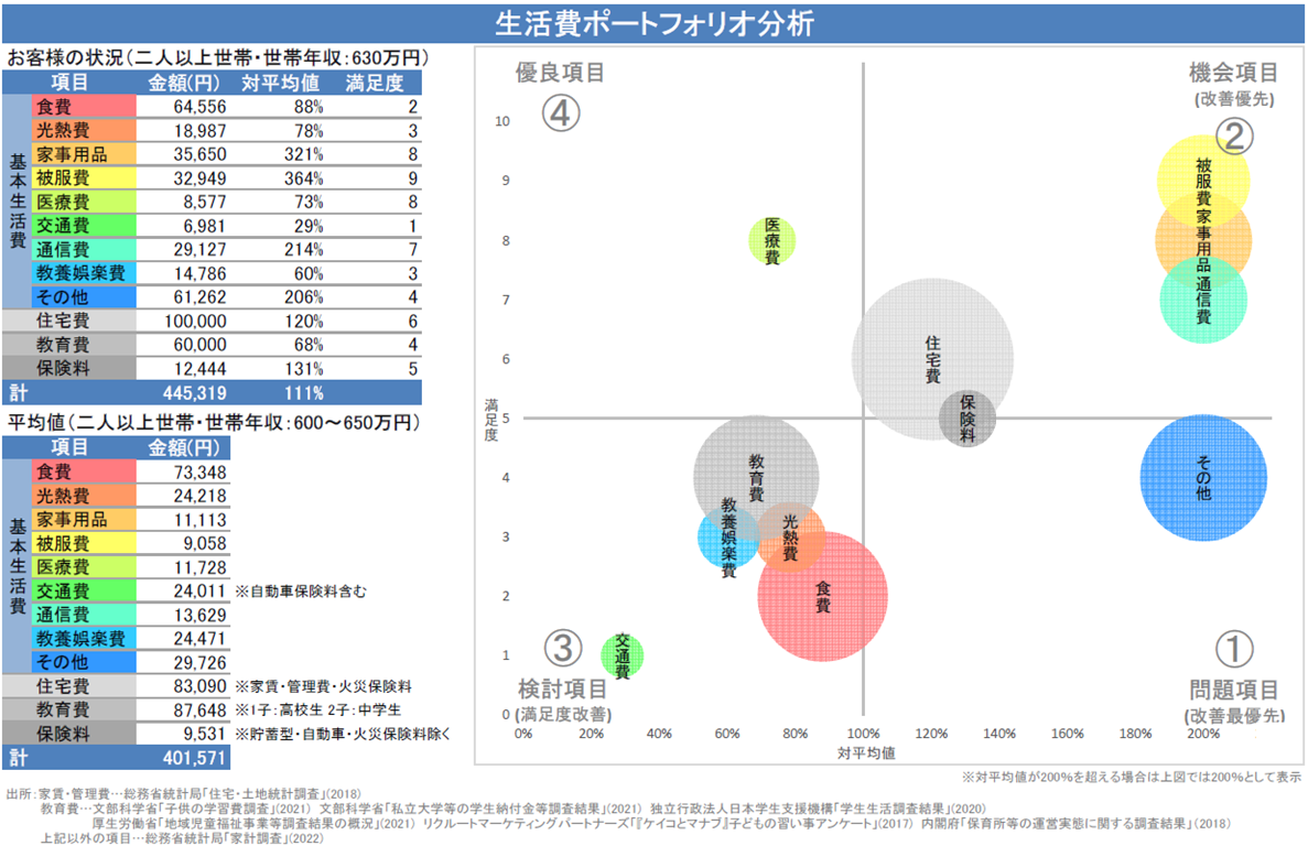 生活費の支出配分を最適化するというプロセスは、一般的にファイナンシャルプランナーの経験の有無や分野ごとの得意、不得意に左右される面があることは否めませんが、このフレームワークを実施し、その結果を基に付録の「生活費改善チェックシート」で具体策に落とし込むというプロセスにより、自信を持って客観的、論理的な「生活費分析・改善コンサルティング」を相談メニューに加えることができます。