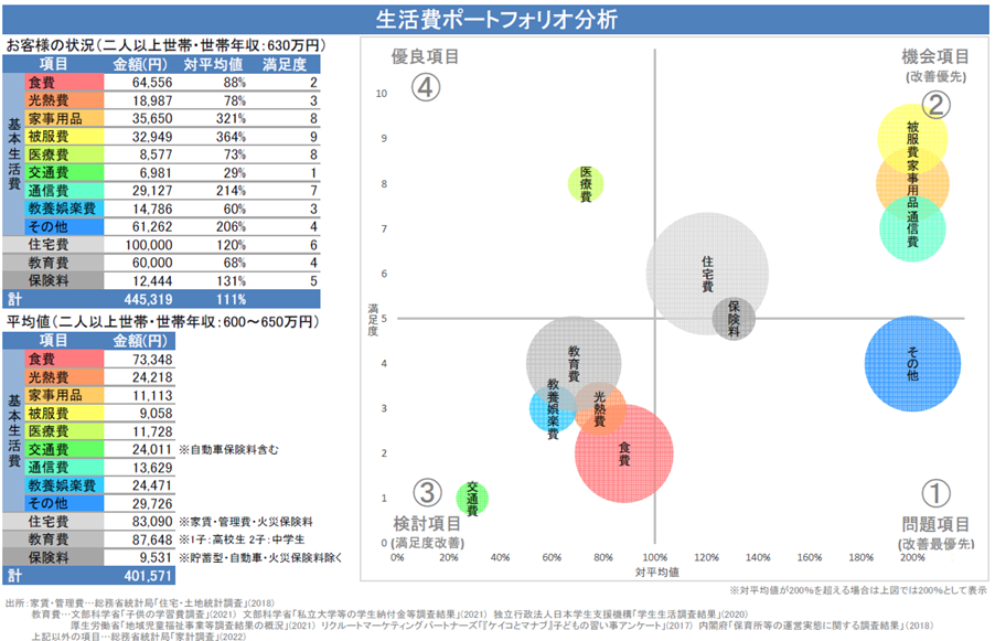 対平均値・満足度・金額の大小から支出項目を分析、改善の優先順位を客観的に明確化できる