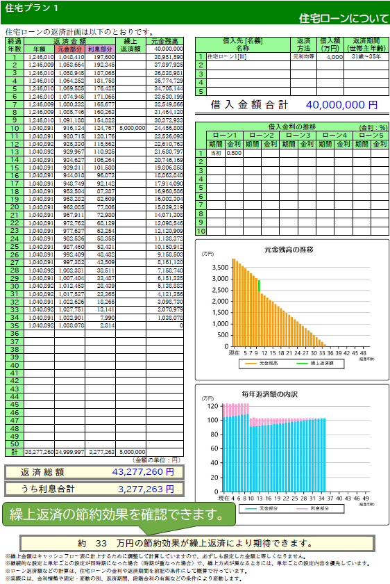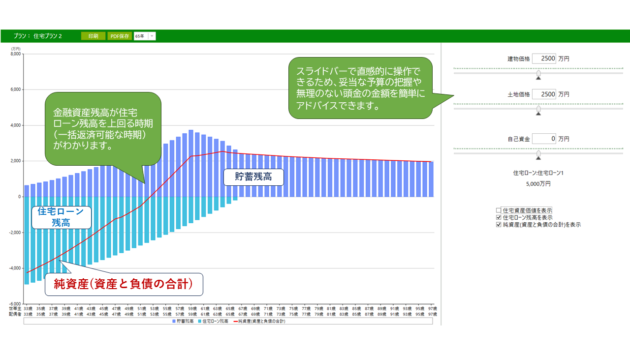 マイホーム名人は、対面型のコンサルティングでの使いやすさも重視しています。 シミュレーション結果をその場でお客様と一緒に確認しながら説明できるように、出力画面が工夫されています。