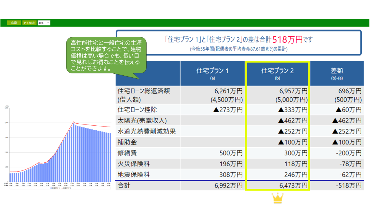 グラフおよび一覧表で、2つのプランを比較可能です。高性能住宅と一般住宅の生涯コストの比較の他、賃貸の場合とマイホーム取得した場合や、今購入した場合と5年後に購入した場合など、自由に比較できます。