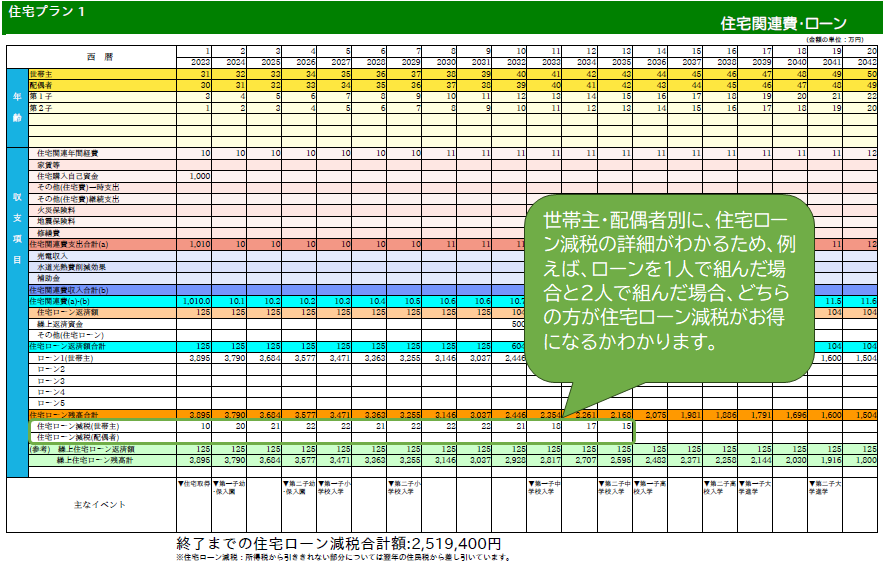 今後最大80年間の住宅関連費・住宅ローン・住宅ローン減税の推移を参照できます。